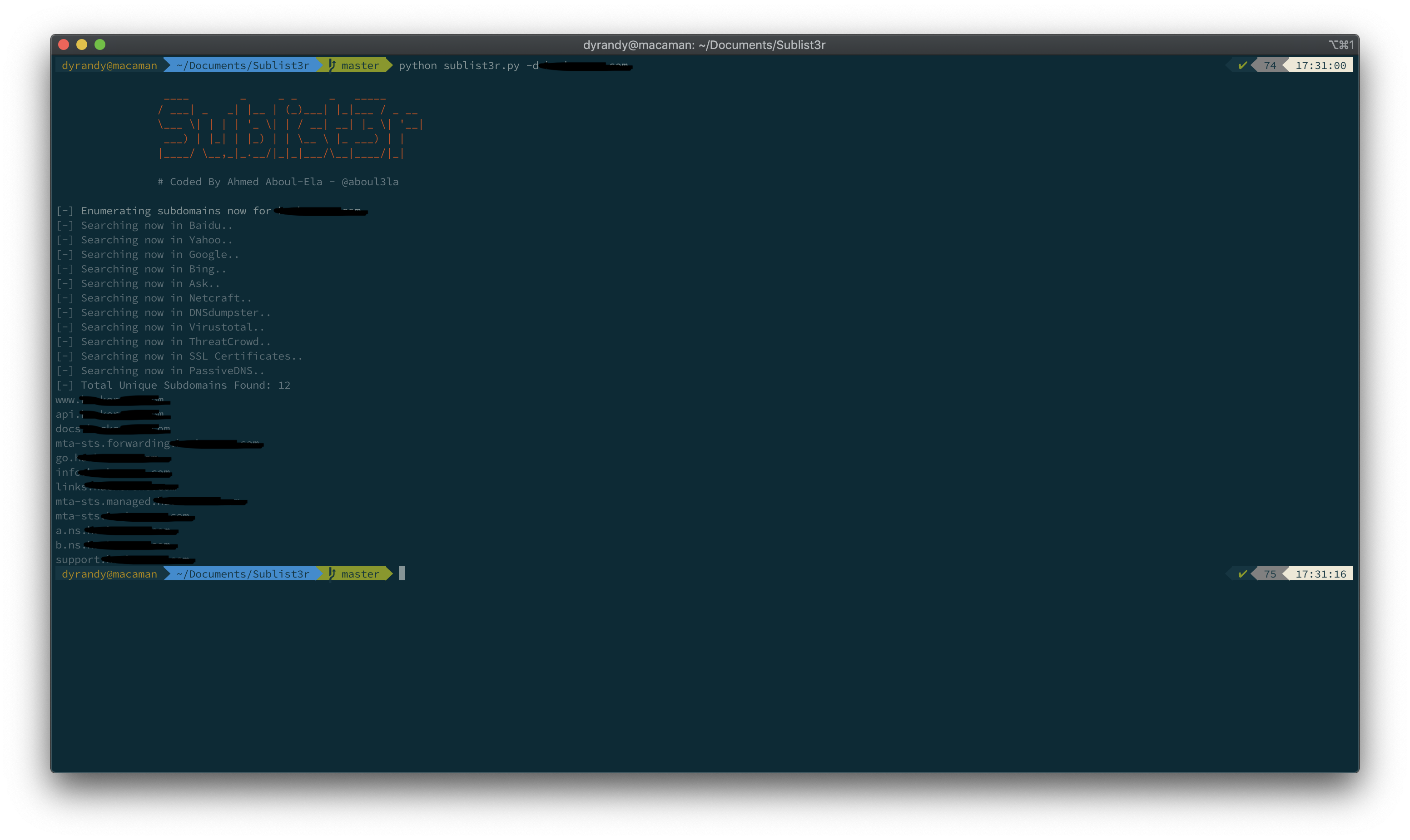 다음으로는 Sublist3r이라는 매우 간단한 툴이다. Ahmed- Aboul-Ela가 만들었고 다양한 서치엔진들을 통해 서브도메인들을 찾는다.